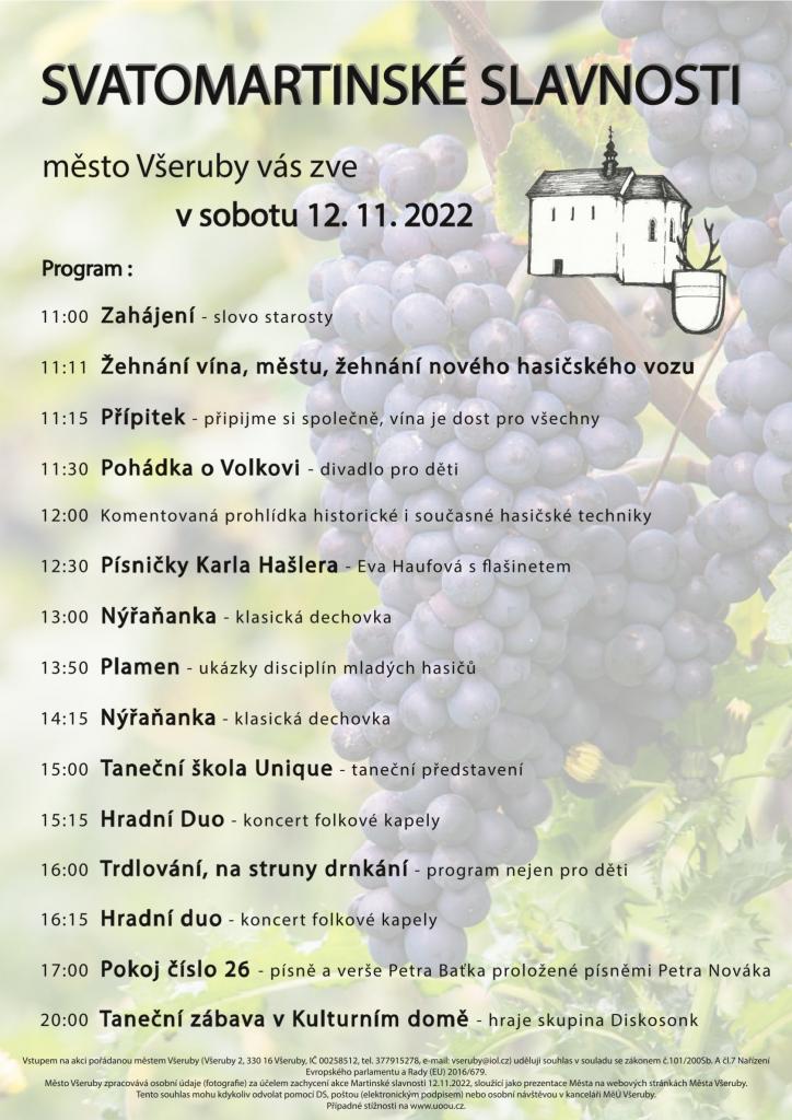 Tradičně začneme přípitkem a žehnáním vínu a letos také novému hasičskému vozu. Poté budou následovat různá kulturní vystoupení - divadlo, dechovka, taneční vystoupení, folková hudba, písničky Karla Hašlera nebo Petra Nováka atd. včetně představení našich hasičů a jejich techniky. Celý den vyvrcholí od 20 hod v kulturním domě Svatomartinskou taneční zábavou, kde nám zahraje hudební skupina Diskosonk s naší všerubskou Naty Kelešovou. Po celou dobu konání slavností je připraveno bohaté občerstvení. Na všechna vystoupení včetně zábavy je vstupné zdarma.