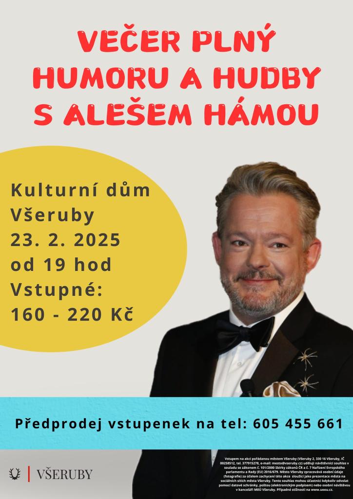 Večer plný humoru a hudby s Alešem Hámou se koná 23.2.2025 od 19:00 v Kulturním domě Všeruby. Vstupné je 160 - 220 Kč. Akce je organizována městem Všeruby, které zpracovává fotografie pro prezentaci na sociálních sítích. Souhlas se zpracováním lze kdykoliv odvolat.